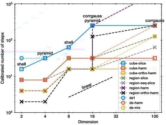 For the 100d problem, region-harm did not converge, even for ; it is set to a arbitrary high value in this plot. The whitened hit-and-run methods (region-harm, region-ortho-harm) need the most steps, together with the de1. Only cube-harm needs few steps even in high-d. The calibrated scaling factors for each method are listed in Table 1.