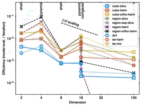 Figure 3 presents the efficiency of each method. Specifically, this is the average number of model evaluations per NS iteration for the configuration where the shrinkage test indicates adequate performance (Figure 2). Overall, all curves in Figure 3 show approximately a behaviour. There is substantial vertical scatter, indicating that the efficiency is diverse across the methods and also dependent on the problem. For example, the efficiency is generally higher for the pyramid geometry than for the more difficult shell.