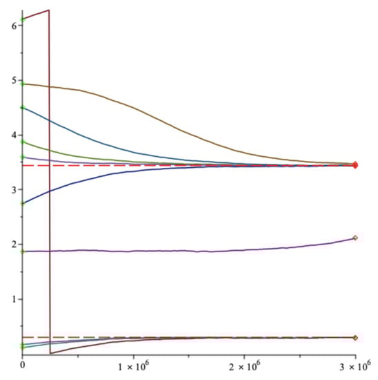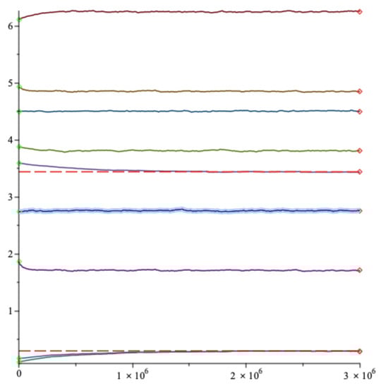 We notice that in stationary situation (where we suppose that very little varies) we have which is equal to when . In Figure 3, we display our simulations as a sequence starting with a random initial . The learning rate is . We simulate nine parallel fast gradient descents randomly initialized sharing the same random feature sequence , with 3,000,000. The gradient descent converges fast but does not converge on the good value . Again it is due to the fact that the target function has several local maxima which act like a trap for the gradient descent.