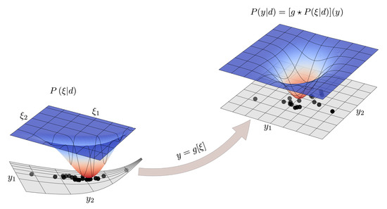 where denotes a function of being evaluated at m, and denotes the matrix square root of . See Figure 1 for a visualization of the effect of the coordinate transformation on probability densities.