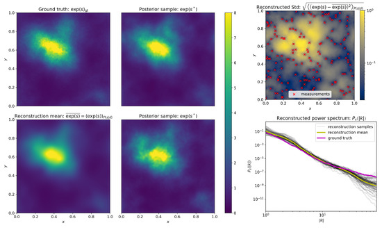 with N being the known noise covariance, and R denoting a linear measurement. For the simplest case, we chose R to be an evaluation operator that measures at multiple locations in space. For the displayed examples, R was set to measure ∼1% as many locations as there were numbers of pixels in the space on which s was discretized, which were randomly selected. Furthermore, N was set to be a diagonal matrix with the same noise standard deviation for all measurements. The log-signal s was assumed to a priori follow a statistically homogeneous and isotropic Gaussian random process, fully specified via its power spectrum . The functional form of was also assumed to be unknown a priori; therefore, it was to be inferred from the observations as well. A suitable prior for based on an integrated Wiener process on double-logarithmic scale, as well as the reformulation of the joint random process for s and as a generative process, was discussed in detail in [9]. Both quantities have to be inferred simultaneously, and their joint distribution was approximated using geoVI. Figure 2 displays the measurement setup, a mock example, and the reconstruction thereof. While the setup was simple and free from additional measurement effects such as point-spread functions, unknown or non-Gaussian noise statistics, and instrument calibration effects, it did cover the relevant challenges arising in imaging, such as a sparse and irregular measurement coverage (see top right panel of Figure 2) and missing prior information regarding relevant correlation scales. As can be seen, geoVI appears to be able to accurately solve such imaging problems. It not only recovered the distribution of s (and ) accurately but also the posterior distribution of . A detailed study of the overall reconstruction quality is beyond the scope of this work (see [2] for an in depth study). Nevertheless, qualitatively, we see that the posterior standard deviation map, shown in Figure 2, covered relevant aspects of the remaining posterior uncertainties. At the measurements, the uncertainty was small, and the information gained from these locations also informed their neighborhood. Multiple nearby measurements could also efficiently constrain a larger area together leading to a structured uncertainty map that depended on the measurement layout in a nontrivial fashion. Finally, the recovered posterior distribution of the prior spectra also qualitatively provided meaningful results. The uncertainty increased towards smaller scales (larger values of ) as the measurement setup overall provideed less information regarding these scales compared to larger scales.