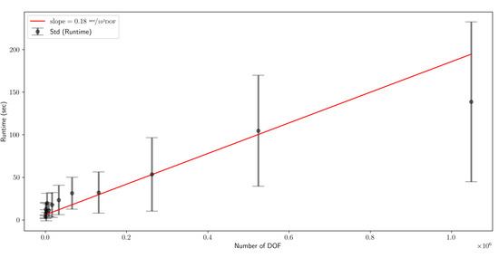 Runtime of the geoVI algorithm as a function of the number of DOF and number of data points. All runs were performed on a single core of a 12th Gen Intel Core i7-1260P processor. For each size configuration, 10 independent runs with different random realizations were performed. The black dots and the gray bars denote the mean and standard deviation of these runs, respectively. The red line is the optimal linear fit to the mean and standard deviations.
