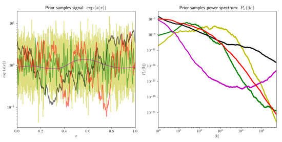 Random realizations of the joint prior process of the observed signal (left) and corresponding power spectra (right). Matching colors in both panels correspond to samples that belong together. Specifically, each spectrum on the right is randomly generated and the used as the prior power spectrum for a log-normal process to generate the corresponding realizations on the left.