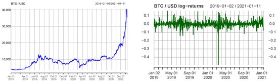 The data used here are from the set of close-day prices of several cryptocurrency pairs between 1 January 2019 and 11 January 2021. Figure 2 shows the price of Bitcoin against USD (left) and the corresponding log returns (right). Predicting price changes is very challenging. In fact, in economics, log returns are often assumed to be independent (and hence prices are assumed to be Markov). Indeed, one can see no obvious relation on the left chart on Figure 3, which plots logreturns (abscissa) and (ordinates). In reality, however, some amounts of information and correlations exist, which can be seen from the plot of the autocorrelation function for BTC/USD shown on the right chart of Figure 3.