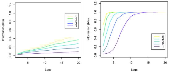The average amounts of mutual information between predictors and response in the training sets, computed using Gaussian approximation (left) and using binary discretization (right). The abscissa shows the numbers n of lags; different curves correspond to numbers m of symbols used.