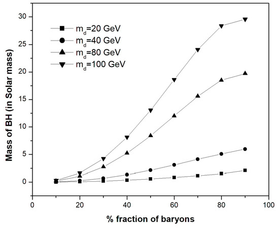 Mass of BH for tidal break up versus fraction of baryonic particles admixed to form the primordial planet for different-mass DM particles ranging from 20 GeV to 100 GeV.