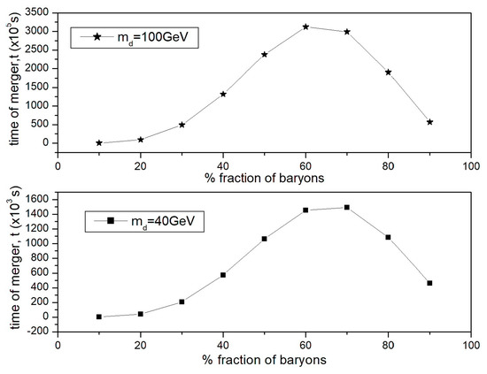 Merger time versus fractions of baryons in forming the primordial planet for DM particles of masses of 40 GeV and 100 GeV.