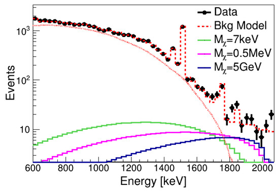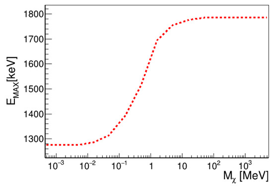 Finally, the expected behaviour of the maximum of the detected energy distribution in 76Ge as a function of is shown in Figure 3. It is important to note that a direct measurement of the DM particle mass in the range 100–10 MeV could, in principle, be feasible with this approach. In particular, this is due to the deformation of the electron energy distribution caused by the upscattering of the particle.
