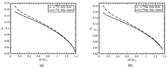 Love number as a function of the gravitational mass for a fully fluid or a fully elastic WD made of oxygen (a), or magnesium (b).