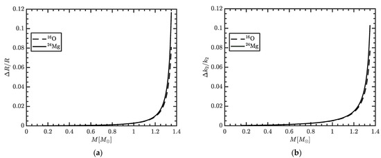 Relative errors incurred by the use of Newtonian theory instead of general relativity on the stellar radius (a), and the Love number (b), as a function of the gravitational mass , for oxygen or magnesium WDs.