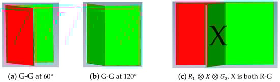 An intuitive example should help. Consider two adjoined walls forming an interior angle ϑ such that each wall is randomly painted red on one side and green on the other (Figure 2a,b). If we randomly choose a wall and look at one side, then the probability P(R) = P(G) = ½. If we now ask, what is the probability that two colors face each other it is possible to have two green walls facing each other and separated by an interior angle , which also means that the two reds are adjoined with respect to the exterior angle 2π − or vice versa. We can then define a probability model related to the interior (or exterior) angles by and .