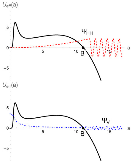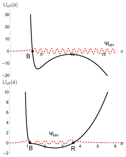 where and . Looking at Equation (1), one can see the similarity of the Wheeler–DeWitt equation to the Schrodinger equation with zero-energy eigenvalue. Moreover, from Figure 1, one can see that the effective minisuperspace potential has two regimes: the classically forbidden regime (the so-called Euclidian regime) and the classically allowed regime. In fact, the barrier shape of the effective minisuperspace potential manifests the analogy of the creation of the universe out of nothing via quantum tunneling phenomena. Classically, the universe contracts from a large size, bounces and expands. Quantum mechanically, the universe can start at the zero scale factor, with zero energy, i.e., nothing (“nothing” here means no space, time or matter), and then tunnel through the barrier to the classical expanding universe. As the potential has a barrier shape, the wavefunction is a superposition of growing and decreasing wave modes inside the barrier, while it is a superposition of oscillatory wave modes outside the barrier. By analogy with quantum tunneling, tunneling wavefunction describes the boundary conditions while the wavefunction has increasing wave mode towards the Big Bang and has only outgoing wave mode outside the barrier, like a particle escaping the radioactive nucleus. Using the WKB approximation, the wavefunction is given by [9]