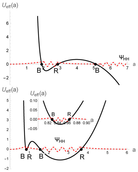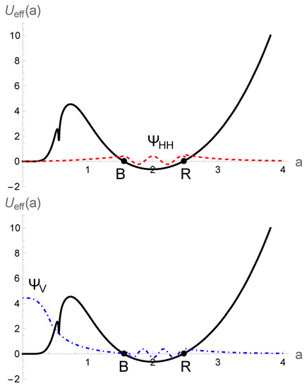 Effective minisuperspace potential, including both holonomy and inverse scale factor corrections (both and terms), and the schematic behavior of the Hartle–Hawking wavefunction (top) and the Vilenkin wave–function (bottom) for and . Points B and R denote the classical bounce and recollapse turnaround points, respectively.