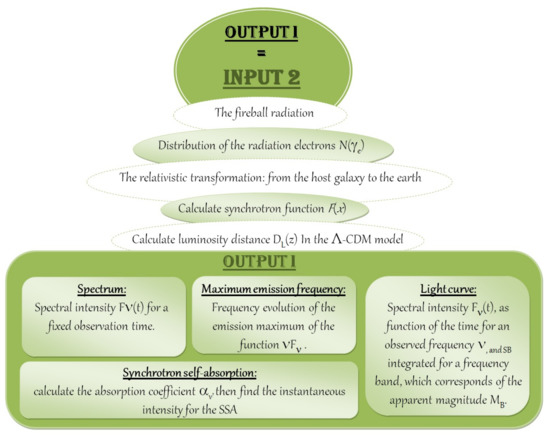 In the second part (Figure 2), we produce the light curves represented by the intensity as a function of time Equation (9). Similarly for the afterglow spectra, the same quantity is used as a function of the frequency.