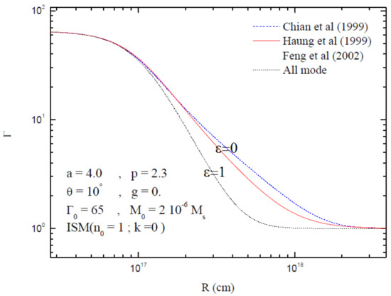 where is the fraction of internal energy radiated by the fireball [12,13], , are the synchrotron cooling and expansion times in the co-moving frame, respectively, and U is the internal energy, which has has many proposed definitions, as shown in Table 1. Finally, the global conservation of energy is , where the evolution of the Lorentz factor can describe the hydrodynamic evolution of the GRBs afterglows, as shown in Table 1.