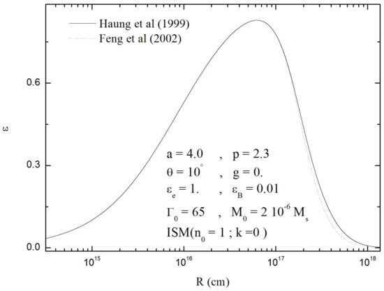 - Figure 4 displays the evolution of the radiative efficiency of the fireball as a function of the distance R, showing that the radiation in Haung’s models is more effective than that of Feng.
