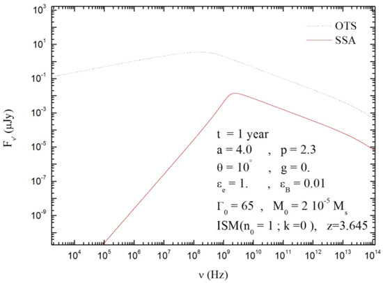 To recognize this part, we use the synchrotron function to determine the spectral power, by calculate the distribution of the radiating electrions, and consider the numbers of the electrons that radiate or do not radiate (adiabatic electrons, for which the characteristic time of emission is very small compared to the time scales). We identify all the relativistic transformations representing the physical quantities in the host galaxy due to the cosmological distance, which is used as the luminosity distance . Finally, we calculate the absorption coefficient Equation (10) to obtain the instantaneous intensity for the SSA Equation (11) and present our results.