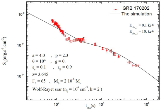 Figure 8. Comparison of calculated afterglow light curves (our code) to the observed data using the XRT / Swift satellite, considering of the integrated fluence, (in erg.s.cm units) in the X-ray band (E = 0.2–10 keV).