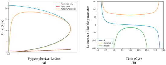 The standard Friedmann–Lemaître metric assumes an isotropic and homogenous Universe []. To reference it for a closed early Universe, a curvature radius when the CMB was emitted and the corresponding scale factor are integrated as in Figure 1.