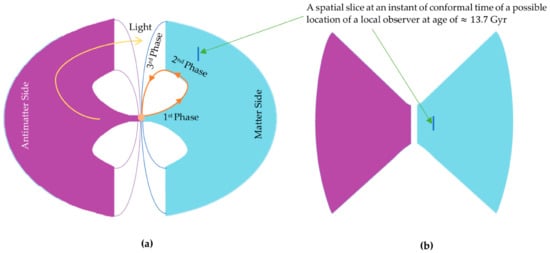 Interestingly, according to the matter wavefunction, there will be a final phase of spatial contraction occurring after approximately 18 billion years, which will lead to a Big Crunch, indicating a cyclic Universe. According to its wavefunction, radiation-only is predicted to propagate from one side to another, as shown in Figure 2a and Figure 3a; this phenomenon may explain why the CMB can be observed, despite propagating faster than matter.