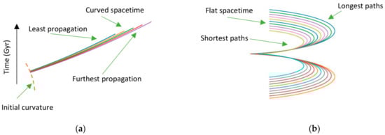 The evolution of spacetime worldlines during two different time periods: (a) the early Universe and (b) the modern Universe.