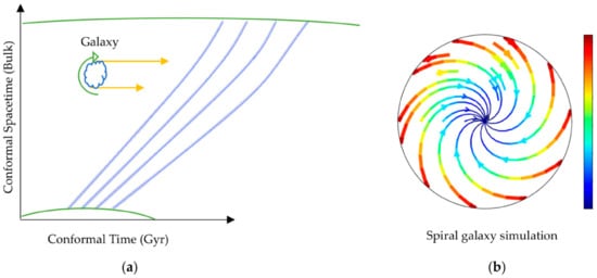 (a) The influence of the background curvature on the galaxy core. (b) A simulation of the rotation of a galaxy in a curved background, with the fastest tangential speeds shown in red.