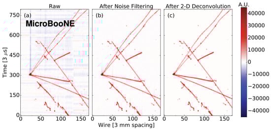 The charge information collected is recorded in the waveform from each wire channel. In the MicroBooNE LArTPC, common noise contains the coherent noise, tails, etc., mainly inherent to electronics. The noise characteristics were studied in the frequency and time domains, and offline noise filters were developed to mitigate the noise []. The measured signal is a convolution of the original signal and detector response. For signal processing, a deconvolution method is used to extract the original signal from the measured signal to remove the detector response [,]. Figure 1 shows the event displays of an example neutrino candidate from MicroBooNE data at different stages: raw data, after noise filtering, and after deconvolution []. The output of this deconvolution is a standard signal shape, i.e., a Gaussian shape, for the hit (charge) reconstruction.