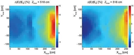 LArTPC technology can provide excellent spatial and calorimetric resolutions. However, the total charge extracted after signal processing normally does not equal the total charge produced from ionization. Distortions in the detector response due to cross-connected TPC channels, space charge effects (SCE), electron attachment to impurities, diffusion, and recombination need to be corrected to obtain the exact amount of charge released from the original interaction []. MicroBooNE is a near-surface detector. There are about 20–30 cosmic muons per 4.8 ms readout window. The accumulation of slow-moving argon ions produced from cosmic muons impinging the TPC can distort the electrical field and the drift trajectories of ionization electrons. Such effects are known as SCE [,,]. Calibration of the electric field can be achieved by using the cosmic muon tracks [] or the UV laser system []. Figure 2 shows an example electric field distortion magnitude for simulation and data using selected cosmic muon tracks []. The SCE has larger effects near the cathode (∼256 cm).