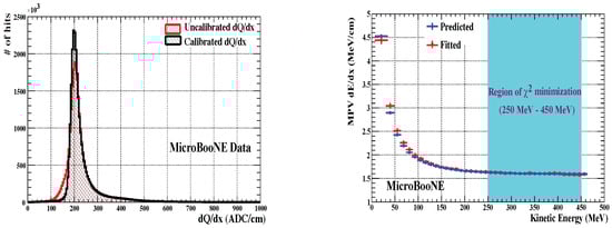 To obtain precise measurements of particle tracking and energy reconstruction, the following two-step calibration was performed. First, we corrected the position and time dependence of the detector response to the ionization charge using data from anode–cathode crossing cosmic muons, which span the entire drift distance and can be used to study any effects that depend on drift distance. This process is known as  calibration. Second, stopping muons from neutrino interactions or cosmic rays were used to study the measured and predicted most probable  (energy loss per unit length) value. We then determined the calibration constant C in a unit of ADC/e (used to convert ADC values to number of electrons (“e”)), which translates the corrected  in a unit of ADC/cm to  in a unit of e/cm. This process is know as  calibration []. Figure 3 shows examples of calibrated and uncalibrated  from the crossing muons and the comparison between the prediction and the fitted most probable  value for stopping muons in MicroBooNE data using the collection plane. The calibration of two induction planes can be accomplished independently following the same strategy.