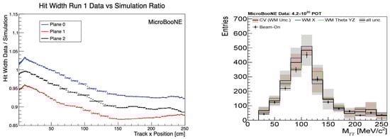 Ratio (data/simulation) and fitted simulation modification functions for mean hit width vs. x on each of the three wire planes (left), and measured diphoton invariant mass distribution using BNB beam data with uncertainties (right). Plots are taken from Ref. [].