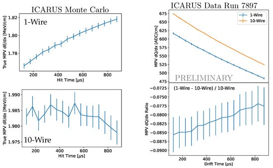 (Left) Profile of true most probable energy loss () for through-going cosmic muons as a function of drift time observed in ICARUS for the (biased) 1-wire measurement (top) and the (unbiased) 10-wire measurement (bottom). (Right) Profile of most-probable charge deposited () from through-going cosmic muons in in ICARUS data as a function of drift time for the 1-wire and 10-wire measurements. In Monte Carlo, the energy loss of the 1-wire measurement increases with increasing drift time (due to the drift dependent effect of diffusion on wire-sensitive thickness). (The 10-wire measurement obtains a larger value (due to the higher wire-sensitive thickness from summing 10 adjacent wires) that is flat across the detector (because the 10-wire spacing dominates over the diffusion length). Correspondingly, in data the most probable value (MPV) of the 1-wire measurement increases relative to the 10-wire measurement with increasing drift time. We use the unbiased 10-wire measurement to extract the electron lifetime in the ICARUS calibration procedure.