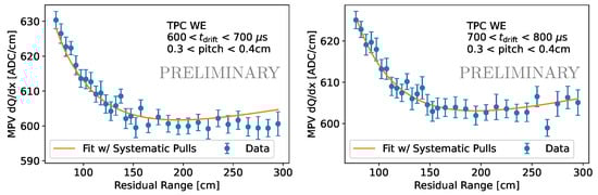 After applying the detector normalization, we are ready to measure the electronics gain (in units of e/ADC). As described in Section 2, we use energy loss from stopping cosmic muons for this measurement. We bin hits from cosmic muons in terms of the inputs to the most probable energy loss formula (Equation (1)): residual range, or the range of the muon track after that hit (to obtain the momentum), track angle to the wire plane, and drift time (both to obtain the wire-sensitive thickness). In each such bin, we fit a Landau distribution convolved with a Gaussian distribution to the histogram of values to obtain the most probable value. We then fit the expected charge loss profile (applying the ArgoNeuT recombination measurement [20]), including the systematic uncertainties (described in Section 2.1) as pull terms. We measure the gain individually in each of the four ICARUS TPCs. The fit matches the profile well in each TPC. We show the fits from one of the TPCs in Figure 2. We summarize the results of the fit, including pull terms, in Table 1. No pull term has a value further than 1 away from the prior.