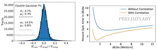 (Left) Comparison of calibrated calorimetric energy and range reconstructed energy for cosmic muons, fit to a double Gaussian. (Right) Systematic uncertainty in energy scale calibration with and without applying correlation between gain and recombination (see Section 3.2).