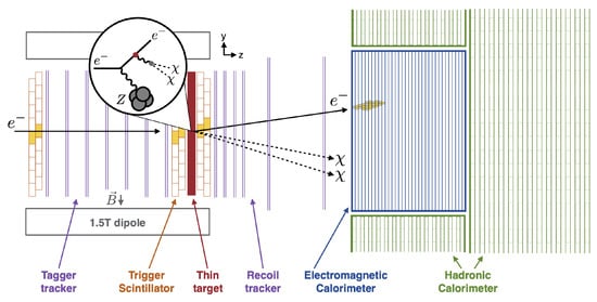 - Åkesson, T.; Berlin, A.; Blinov, N.; Colegrove, O.; Collura, G.; Dutta, V.; Echenard, B.; Hiltbr, J.; Hitlin, D.G.; Incandela, J.; et al. Light Dark Matter eXperiment (LDMX). arXiv 2018, arXiv:1808.05219. [Google Scholar]