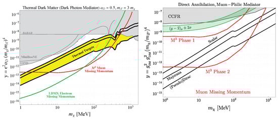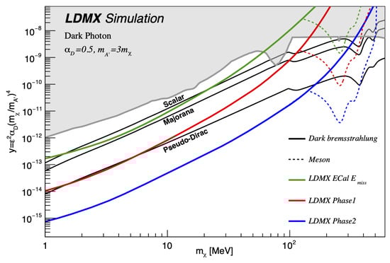 The projected sensitivity of the LDMX experiment for Phase I (red) and Phase II (blue), as defined in the text, as well as when using the Ecal as an active target (green). In this figure, y is a dimensionless parameter, is the kinetic mixing parameter, is the dark photon−dark matter coupling constant, is the mass of the dark matter particle, and is the mass of the dark photon [9].