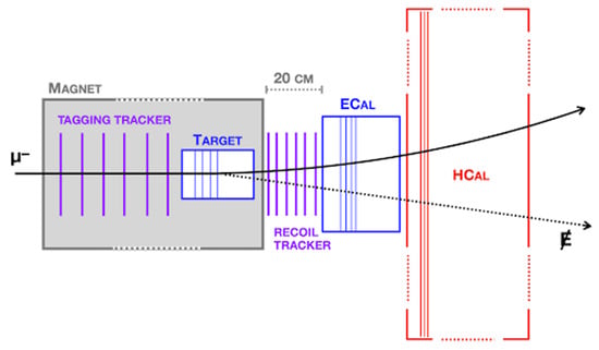 The apparatus for M is proposed to be similar to LDMX and is shown in Figure 3. The design contains both a tagging and recoil tracker to measure incoming and outgoing muon momenta, respectively, as well as a measurement of charged-track multiplicity. Downstream of the trackers is an Ecal used for triggering and rejecting electromagnetic backgrounds and an Hcal used to reject neutral hadrons (though not as deep as LDMX since the PN backgrounds are significantly suppressed). The major difference between the designs of these detectors is a thick active target for M as opposed to a thin metal target for LDMX. This enables increased signal production in M as well as a measure of SM energy deposition in the target to further reject backgrounds that could mimic a missing momentum signature. It is suggested that the LDMX Ecal material be used as the thick active target, though LYSO is also a viable possibility.