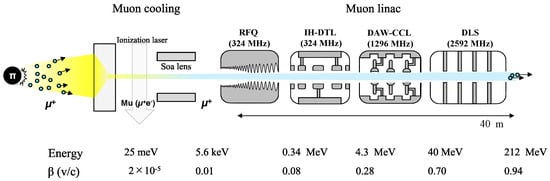 - Otani, M. First muon acceleration and muon linear accelerator for measuring the muon anomalous magnetic moment and electric dipole moment. Prog. Theor. Exp. Phys. 2022, 2022, 052C01. [Google Scholar] [CrossRef]