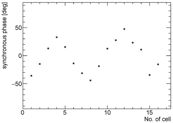 In designing the IH-DTL, the alternating phase focusing (APF) [12] method was chosen as the transverse focusing technique to obtain high acceleration efficiency while keeping fabrication costs low. In the APF method, the beam can be transversely focused by adjusting the synchronous phase of each cell according to arbitrary preferences. This approach eliminates the need for a focusing element like an electromagnet, significantly simplifying the structure of the drift tube and other components. The APF method has been successfully implemented in hadron therapy accelerators proving its effectiveness as a technology [13,14,15]. Figure 2 shows the optimized synchronous phase array for the APF method.