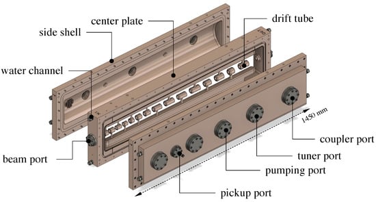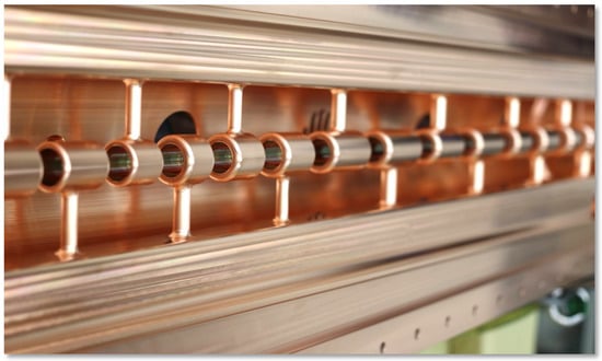 - Kondo, Y.; Morishita, T.; Hasegawa, K.; Chishiro, E.; Hirano, K.; Hori, T.; Oguri, H.; Sato, F.; Shinozaki, S.; Sugimura, T.; et al. High-power test and thermal characteristics of a new radio-frequency quadrupole cavity for the Japan Proton Accelerator Research Complex linac. Phys. Rev. ST Accel. Beams 2013, 16, 040102. [Google Scholar] [CrossRef]