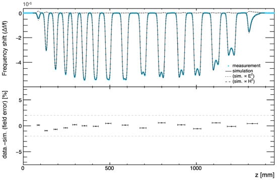 Then, the field distribution was measured by the bead pull method [20]. An aluminum spherical bead with a radius of was pulled along the beam axis at a constant speed, and the frequency shift was measured using a vector network analyzer. Figure 5 shows the result of the bead pull measurement. The top figure represents the frequency shift () along the beam axis. The blue marker shows the measured frequency shift, and the solid line shows the simulated frequency shifts were calculated from . Where is the dielectric constant of the vacuum, and is the magnetic permeability of the vacuum. The bottom figure shows the field error, which is the difference between the square root of the measured and simulated frequency shifts. The black marker shows the averaged field error values within the gap areas, and the horizontal bar represents the gap areas. The averaged field error values are all less than 2%, which revealed that the field distribution reproduced the simulation results well.