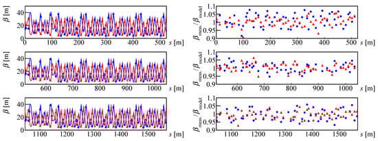 Beta functions (left) and ratios of measured to model beta functions (right). The blue circles and red triangles denote horizontal and vertical measured results, respectively. The blue and red lines in the left panel show horizontal and vertical model betas, respectively.