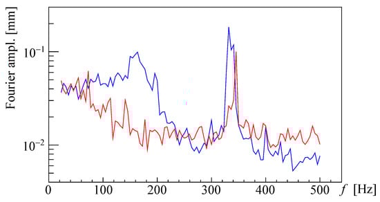 The fractional current deviation below 200 Hz of the new power supplies of the bending magnets is 10 times smaller than that of the old power supplies []. To verify this improvement, we measured horizontal beam positions for 220 ms at intervals of 1 ms. The beam positions at the high-dispersion position, where the model dispersion is , was analyzed via Fourier transformation. The same measurements were also performed before the upgrade of the power supplies of the bending magnets. The results are shown in Figure 2. The beam ripple in the range of 80–220 Hz using the new power supplies (red line) was successfully suppressed compared to the ripple using the old power supplies (blue line). By further optimization of the power supplies, the ripple below 80 Hz will also be lowered. The spectra appearing around at 340 Hz correspond to the synchrotron frequency; their differences do not necessarily show the difference of old and new power supplies because they depend on longitudinal dipole oscillations.