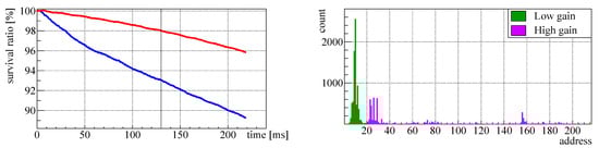 Beam survival ratio measured by DCCT before (blue) and after (red) adjusting split quadrupole families (left panel), and beam loss counts measured by proportional beam loss monitors during 220 ms (right panel). The beam intensity was ppb. The horizontal axis of the right panel represents the address assigned based on the positions of the quadrupole magnets. The gains of the proportional beam loss monitors at non-collimator area (violet bars) were 8 times larger than those at collimator area (green bars).