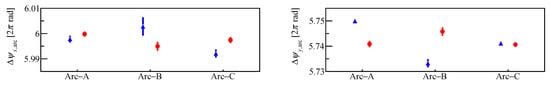 Horizontal (left) and vertical (right) measured phase advances of the three arc sections in the MR before (blue triangles) and after (red circles) adjusting split quadrupole families. The error bars show the rms of 10 data.