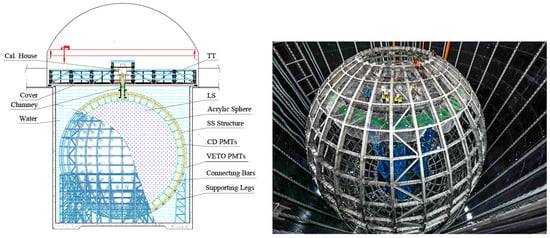 The civil construction of the the JUNO site was completed in December 2021. The underground experimental hall is connected to the surface by a 1266 m slope tunnel and a 564 m vertical shaft. A sketch of the JUNO detector is shown in Figure 2 (left). The Central Detector (CD) will be filled with 20 kton of LS contained in a spherical acrylic vessel with a diameter of 35.4 m. The acrylic panels of the CD detector are being mounted from an installation platform, the construction of which was completed in May 2022. The CD is supported by a stainless steel support structure that was finished in June 2022, as shown in Figure 2 (right). The PMTs with their front-end electronics will be mounted on the support structure. The Water Cherenkov Detector (WCD) will consist of 35 kton of ultra-pure water surrounding the CD. The WCD will serve like an active veto of cosmic muons with an efficiency of >99.5% as well as a passive shield against the external background neutrons and s. The Top Tracker (TT) composed of an array of plastic scintillator plates will cover 60% of the area above the WCD. The direction of muons crossing the TT will be measured with an angular resolution of 0.2, corresponding to 20 cm at the bottom of the CD.