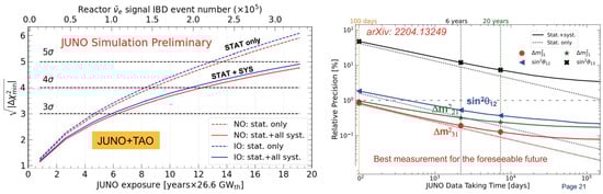 - He, M. et al. [JUNO Collaboration] Sub-percent Precision Measurement of Neutrino Oscillation Parameters with JUNO. Chin. Phys. C 2022, 46, 123001. [Google Scholar] [CrossRef]