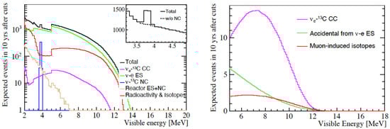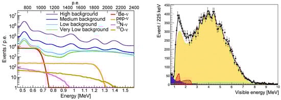 The sensitivity of JUNO to Be, , and CNO solar neutrinos will depend heavily on the achieved level of radio purity. Several radio purity scenarios were considered in a recent study [15], from the Very Low background level achieved by the Borexino experiment [16] up to the High background one (the minimum required for the NMO determination), as demonstrated in Figure 5 (left). For Be neutrinos, JUNO will reach the current precision of 2.7% achieved by Borexino [17] after one year of data collection. For neutrinos, JUNO will improve on the current best result of 17% [17] after two years of data collection, except for the High background scenario, for which six years are needed. For the CNO neutrinos, the constraint on the rate of neutrinos in the spectral fit remains crucial, and can be achieved using existing data and theoretical assumptions [16]. However, JUNO will be able to detect CNO solar neutrinos without the Bi constraint applied in the Borexino analysis [16,18], and will achieve 20% precision in two to four years, again with the exception of the High background scenario. Additionally, JUNO might be able to distinguish the N and O CNO components for the first time.