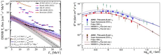 Left: Comparison of model predictions (coloured bands) and existing experimental 90% confidence level upper limits (coloured markers) for the DSNB signal. The estimated sensitivity of JUNO (black markers) reaches the level of current model predictions. From [24]. Right: JUNO’s expected reconstruction of the energy spectra of atmospheric neutrinos of (blue) and (red) flavour [25] with five years of data as compared with existing measurements in the same energy region. The fluxes are multiplied by for graphical reasons. From [1].