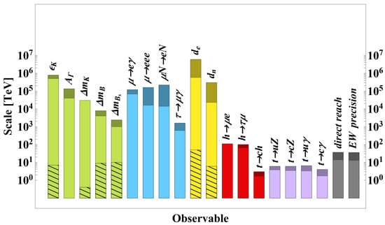 New Physics scales to be indirectly probed by the indicated observables. The darkened areas are the “naïve” New Physics scales, by assuming the Wilson coefficients of order one, the coloured bars indicate the inherent New Physics scales assuming weak interaction strengths, and the hatched areas account for loop suppression due to higher-order effects. Figure taken from ref. [37].