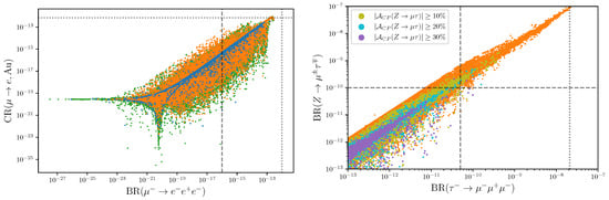 Left Correlation of cLFV observables, for varying values of the CPV Dirac and Majorana phases: vanishing values (blue), non-vanishing (orange), and “special grid” (green); see the description in the text. Right BR vs. BR. The olive-green, cyan, and purple points denote an associated CP asymmetry 10%, 20% and 30%, respectively, while the orange points denote CP asymmetries ≤ 10%. From [42,43].
